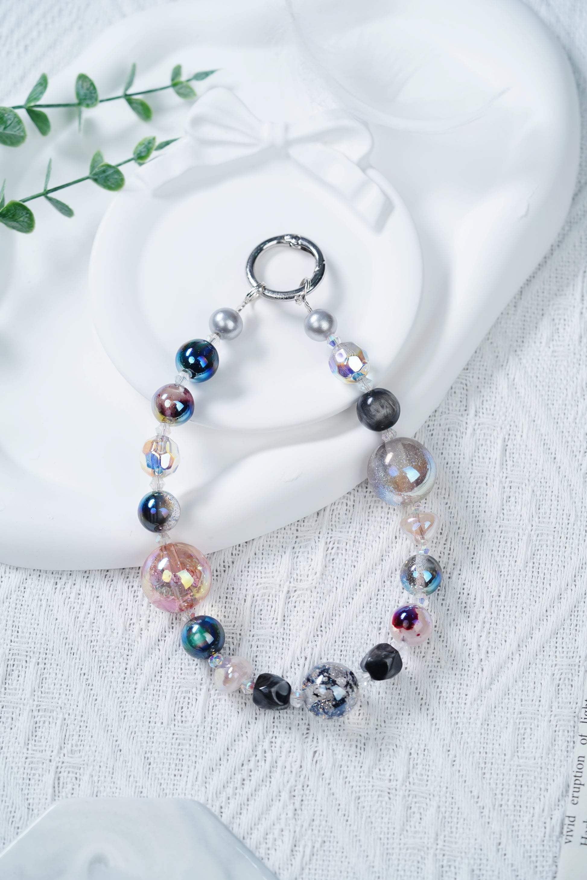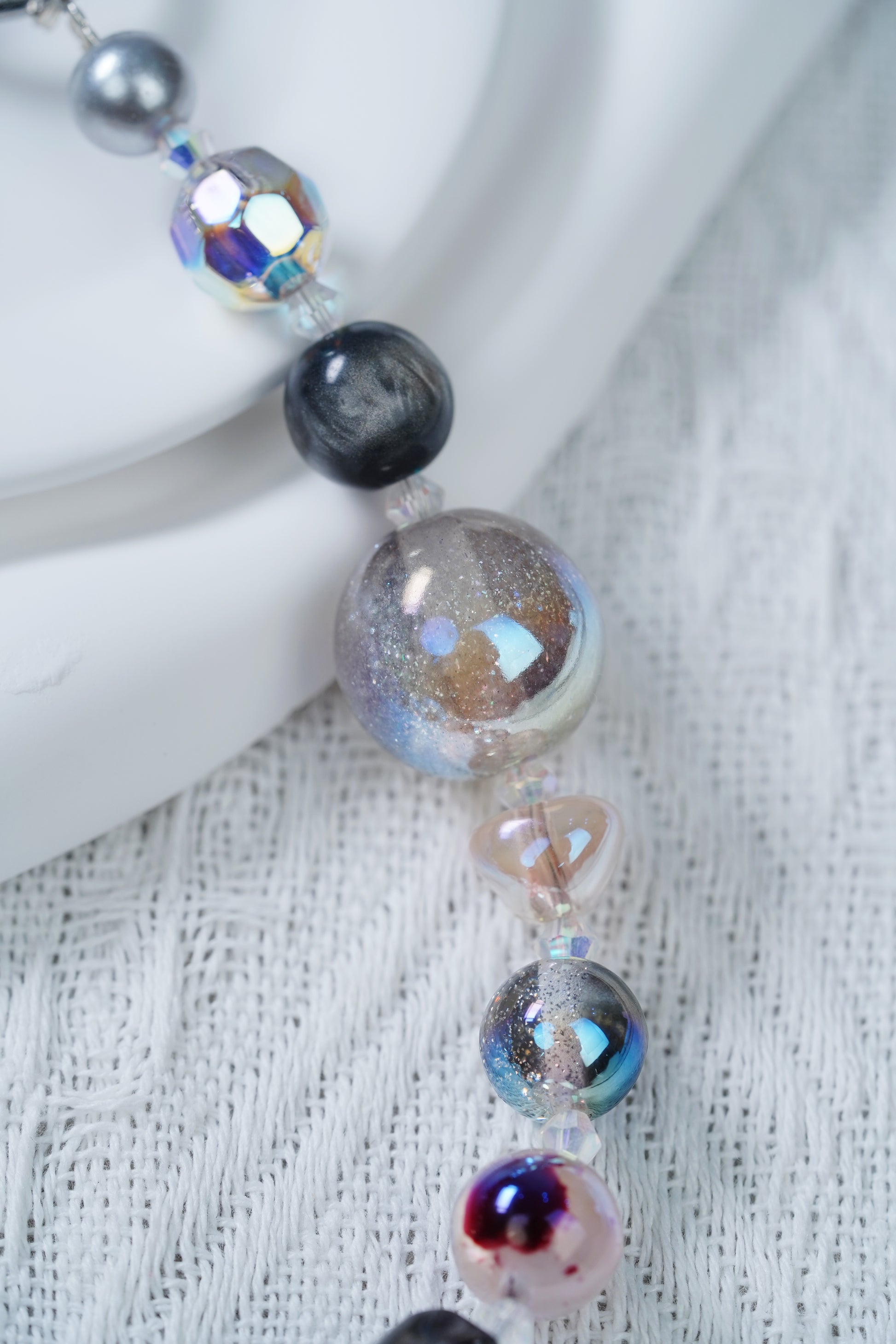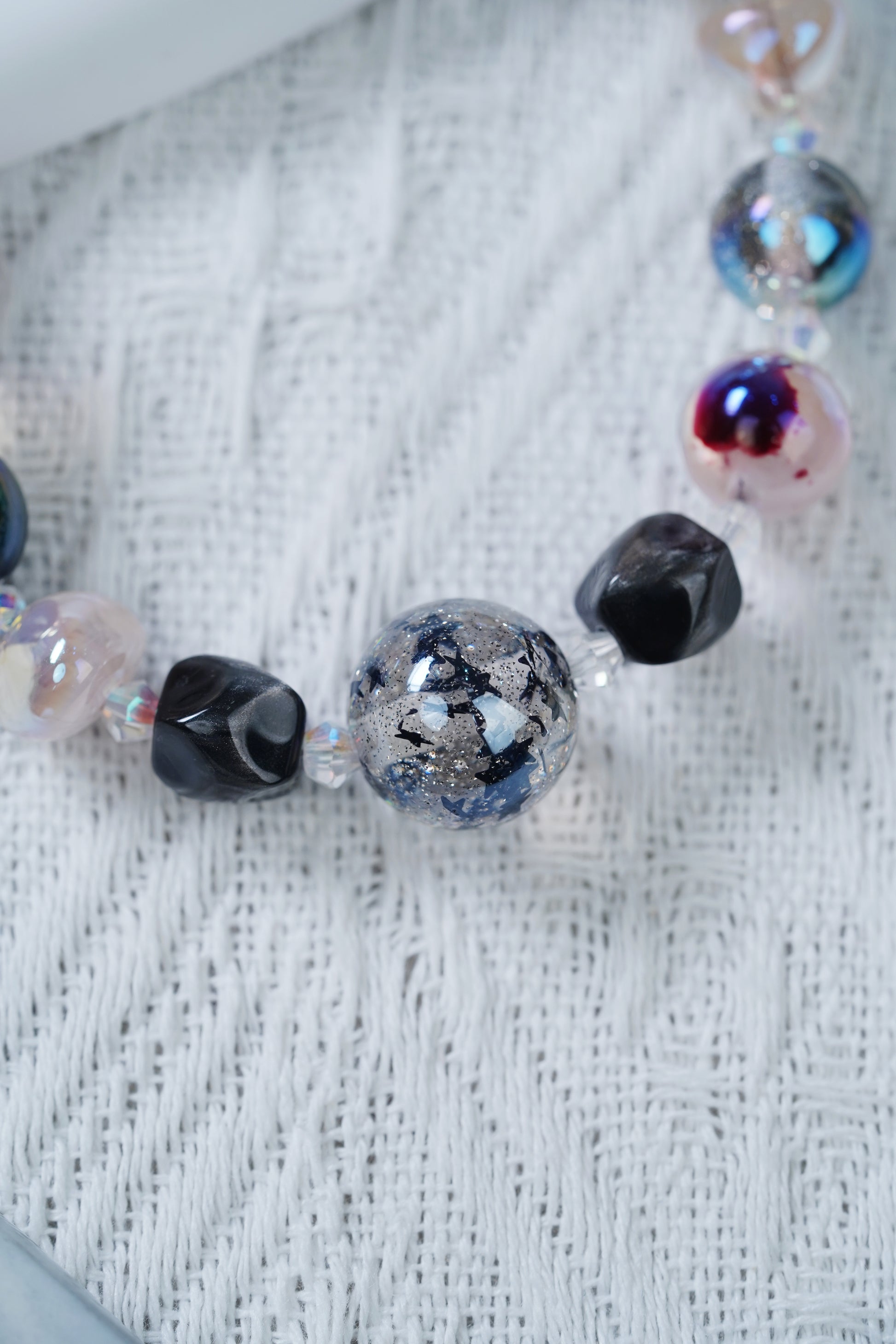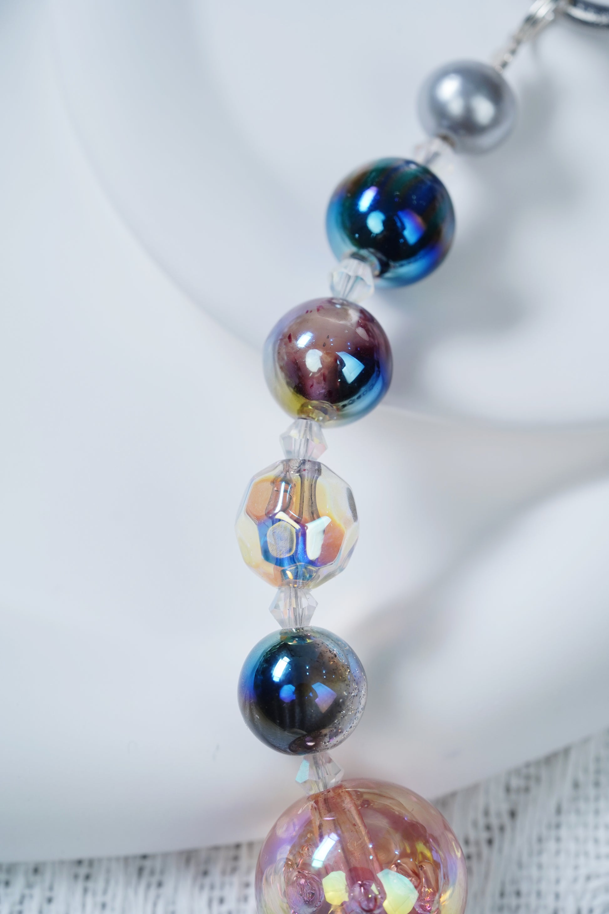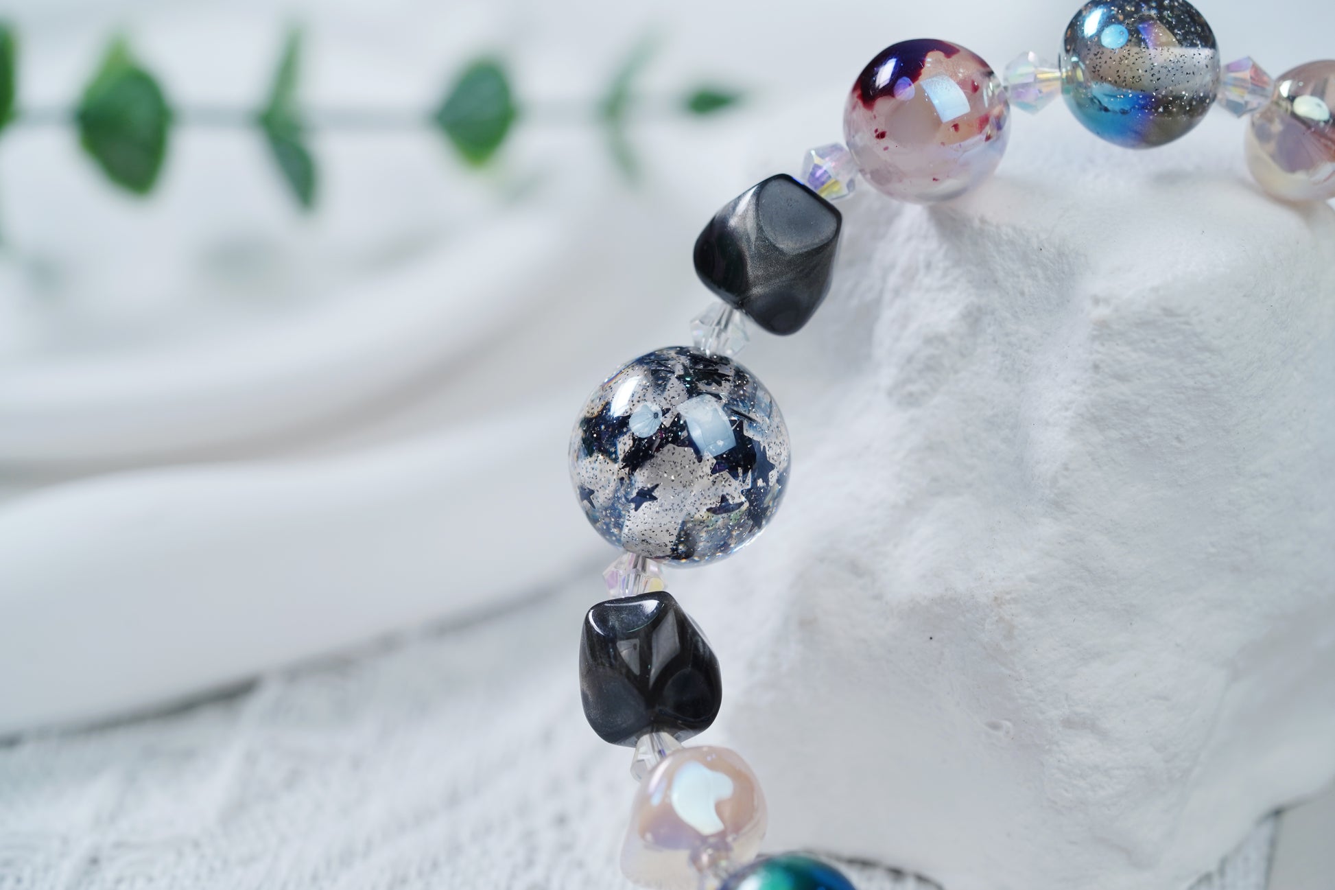 ビーズの色はきらびやかで、深い黒から幻想的な色彩で、光の下で魅力的な光沢を屈折させ、大きなキさの異なる球形のデザインは錯綜していて、さらに生まれてきている。材質は軽くて夫で、着地が良く、壊れていく、独特の配色と造形で、個性的なセンスを示している。