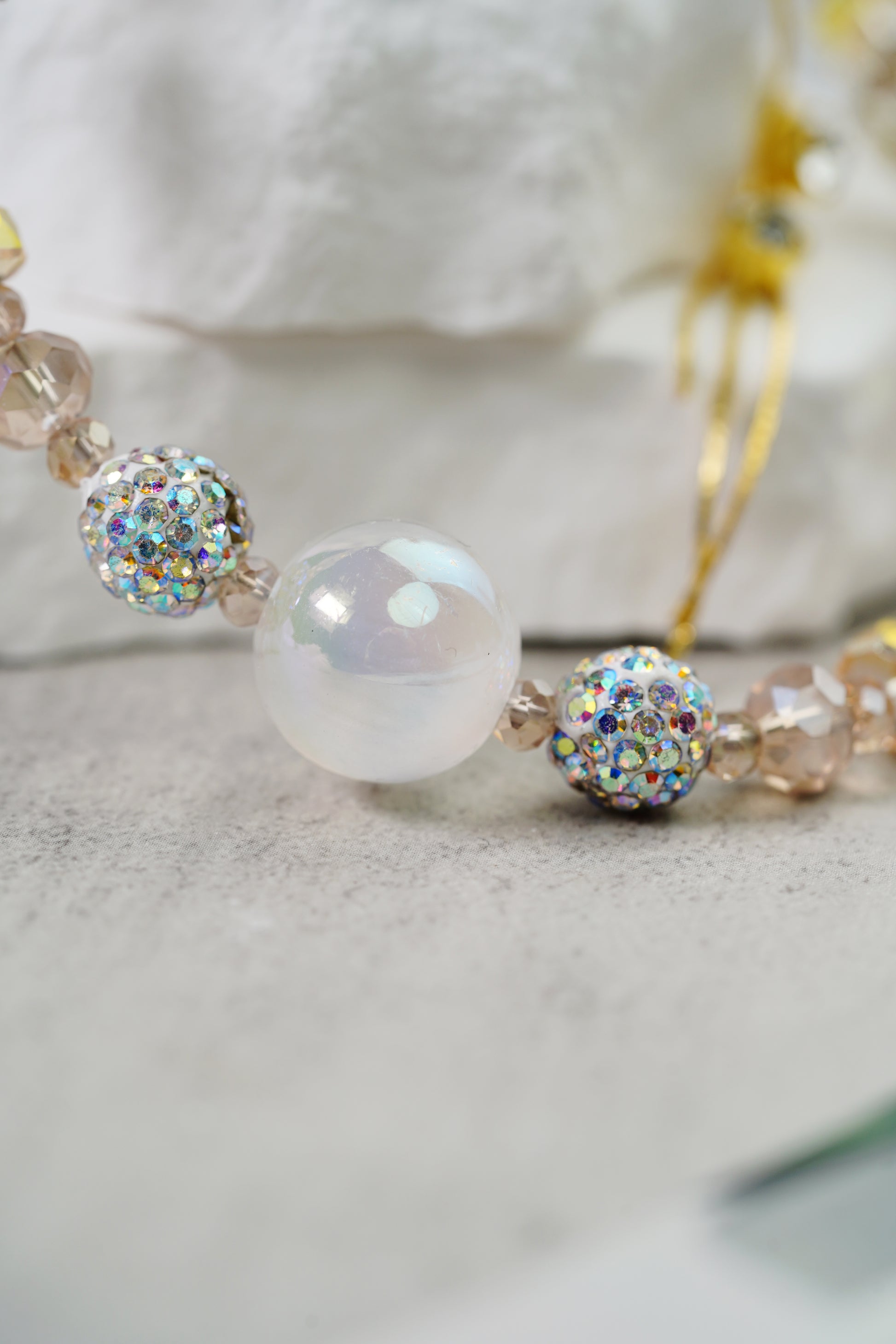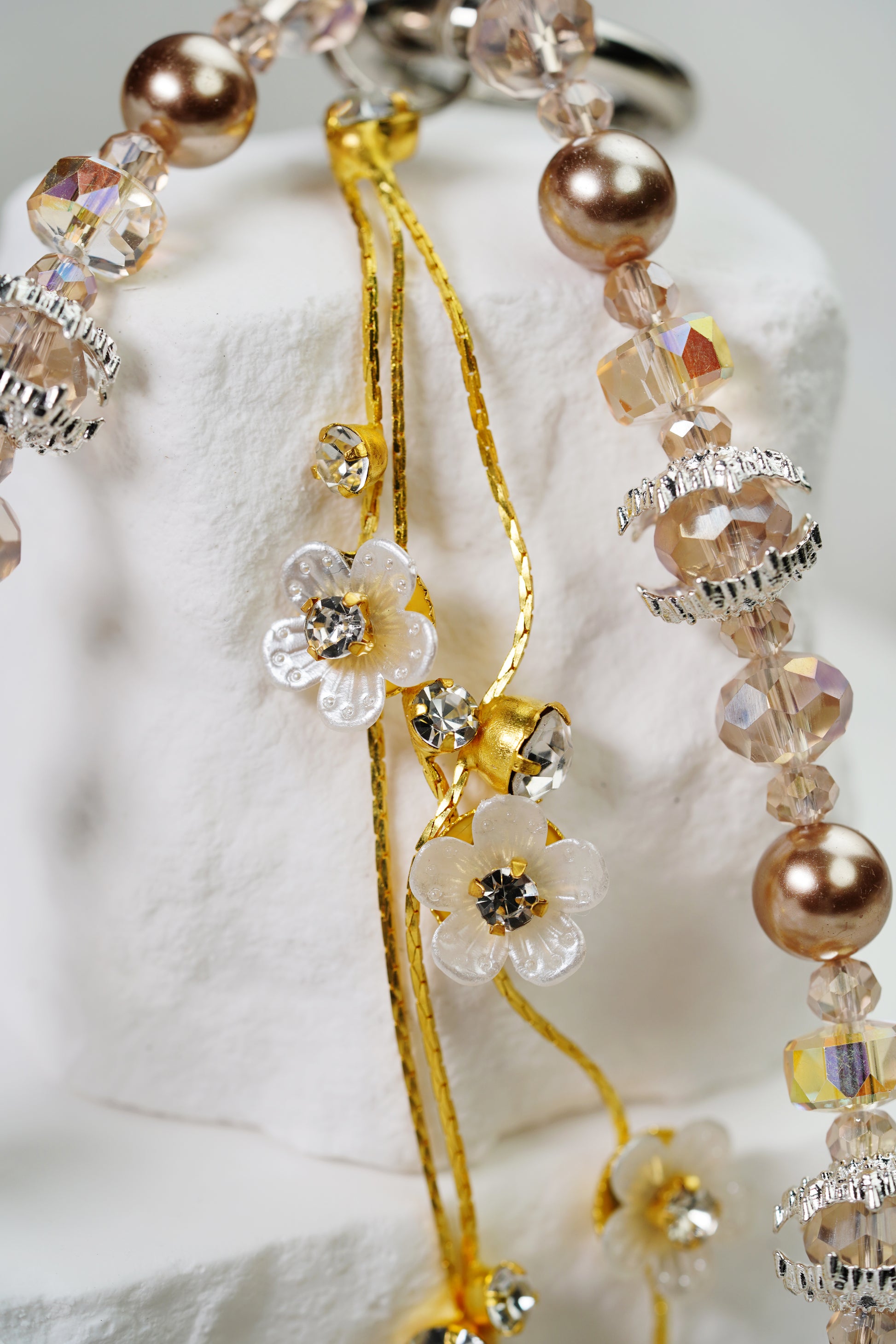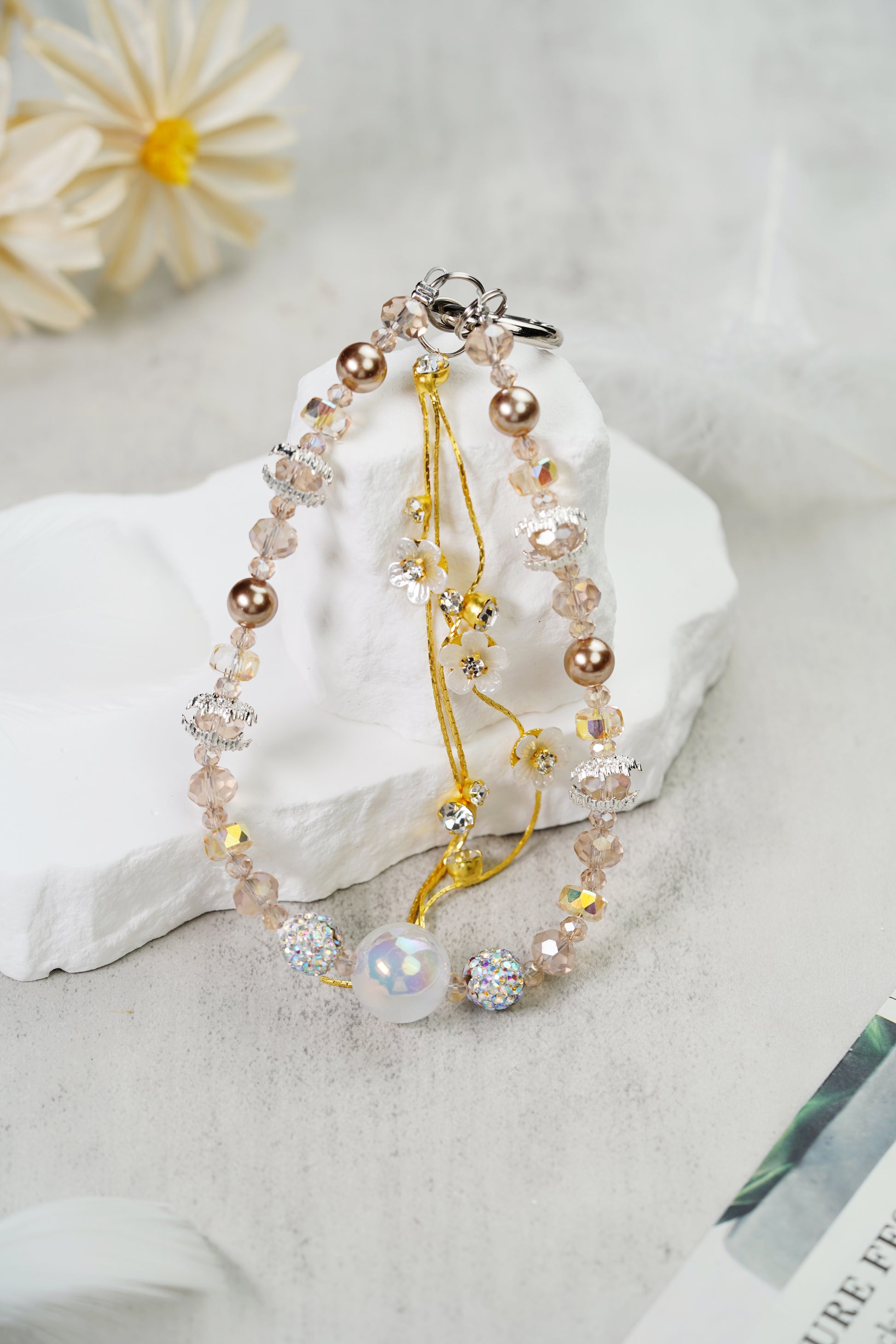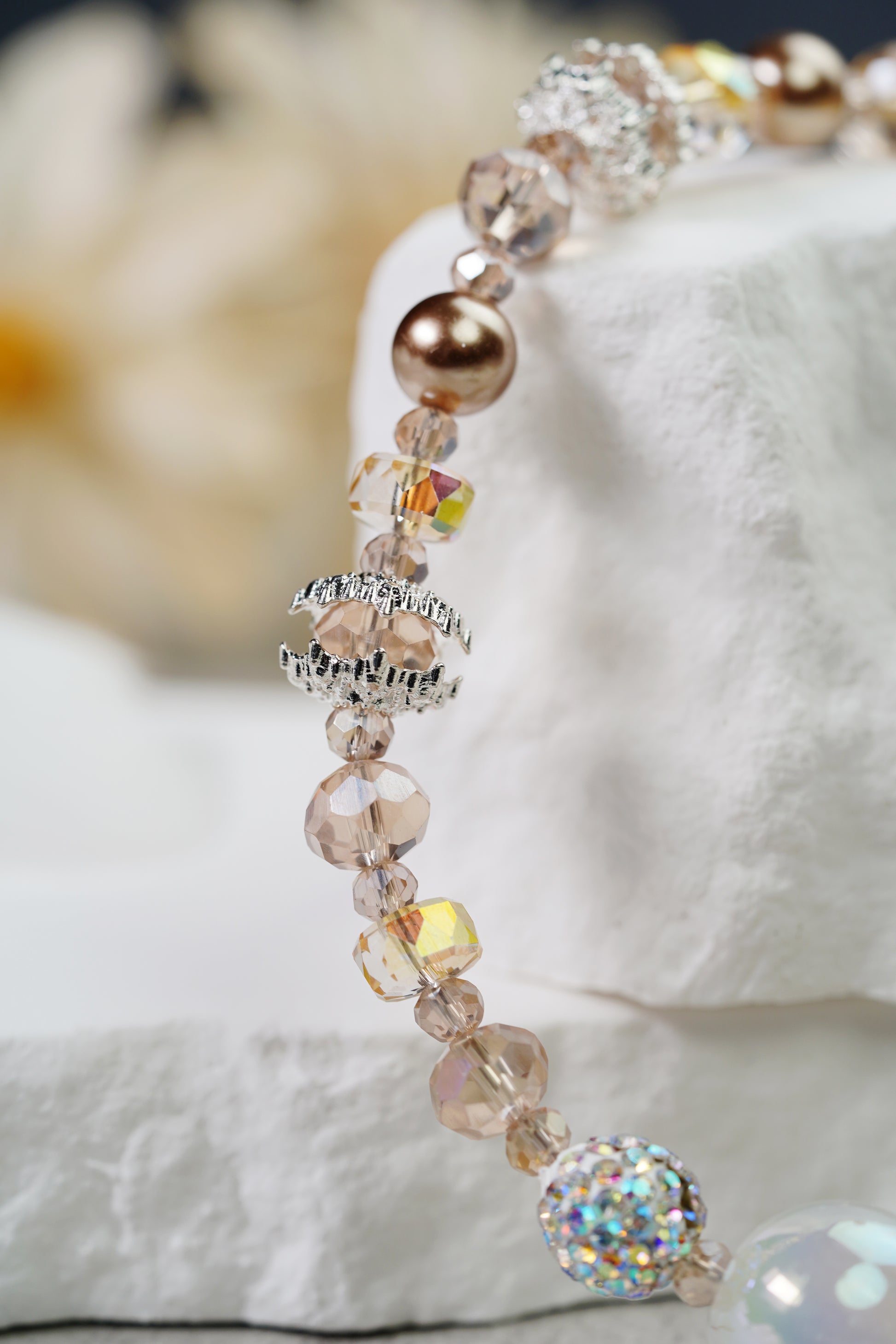 このチーズはファッションとアートの完璧な融合で、丁寧に作られています。ビーズの色調は薄い茶色から深いカレーまでグラッドショーになっており、秋の森の中でキラメキ光のような幻想的な要素を組み合わせています。丸みのある真珠、精緻な花の造形は錯綜しており、簡潔な中に精緻さを失い、全体の造形に独特の魅力を加えている。