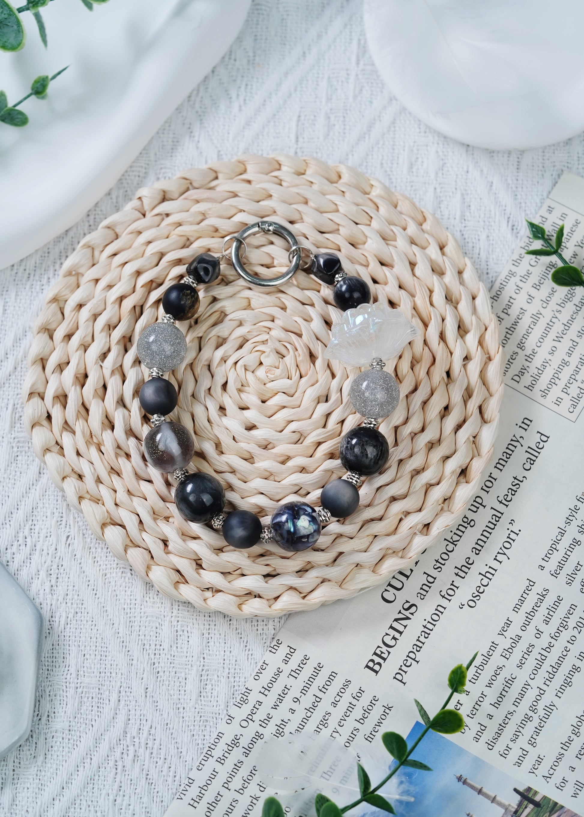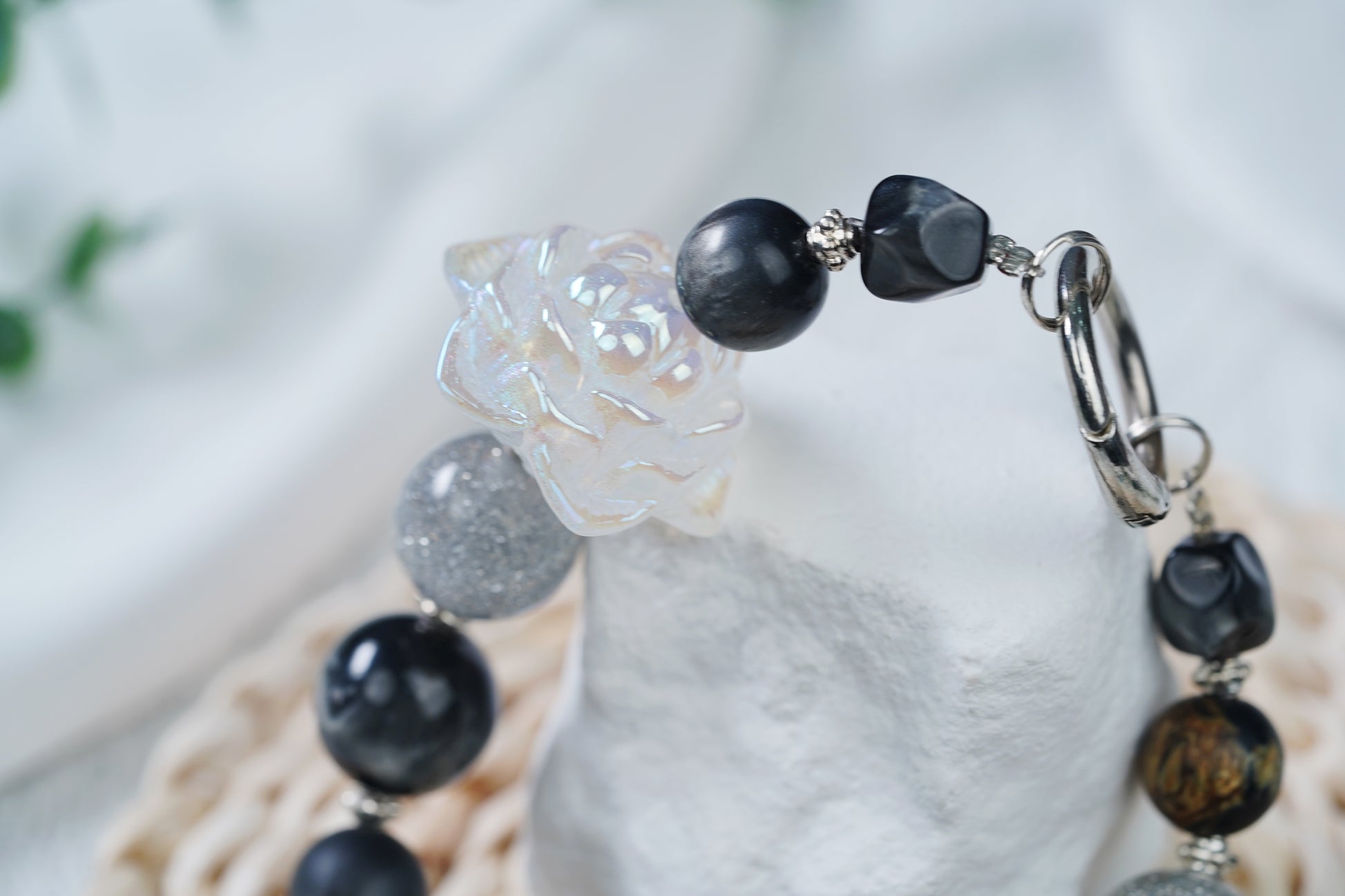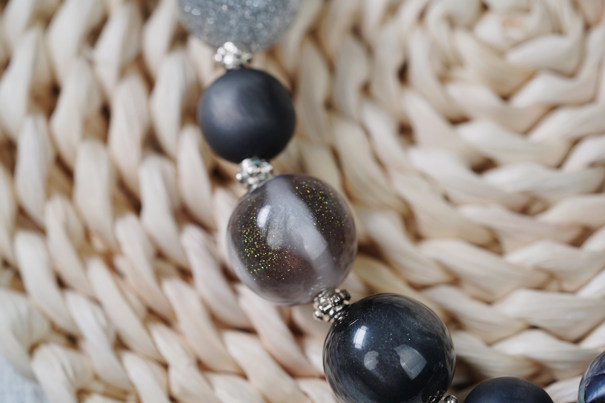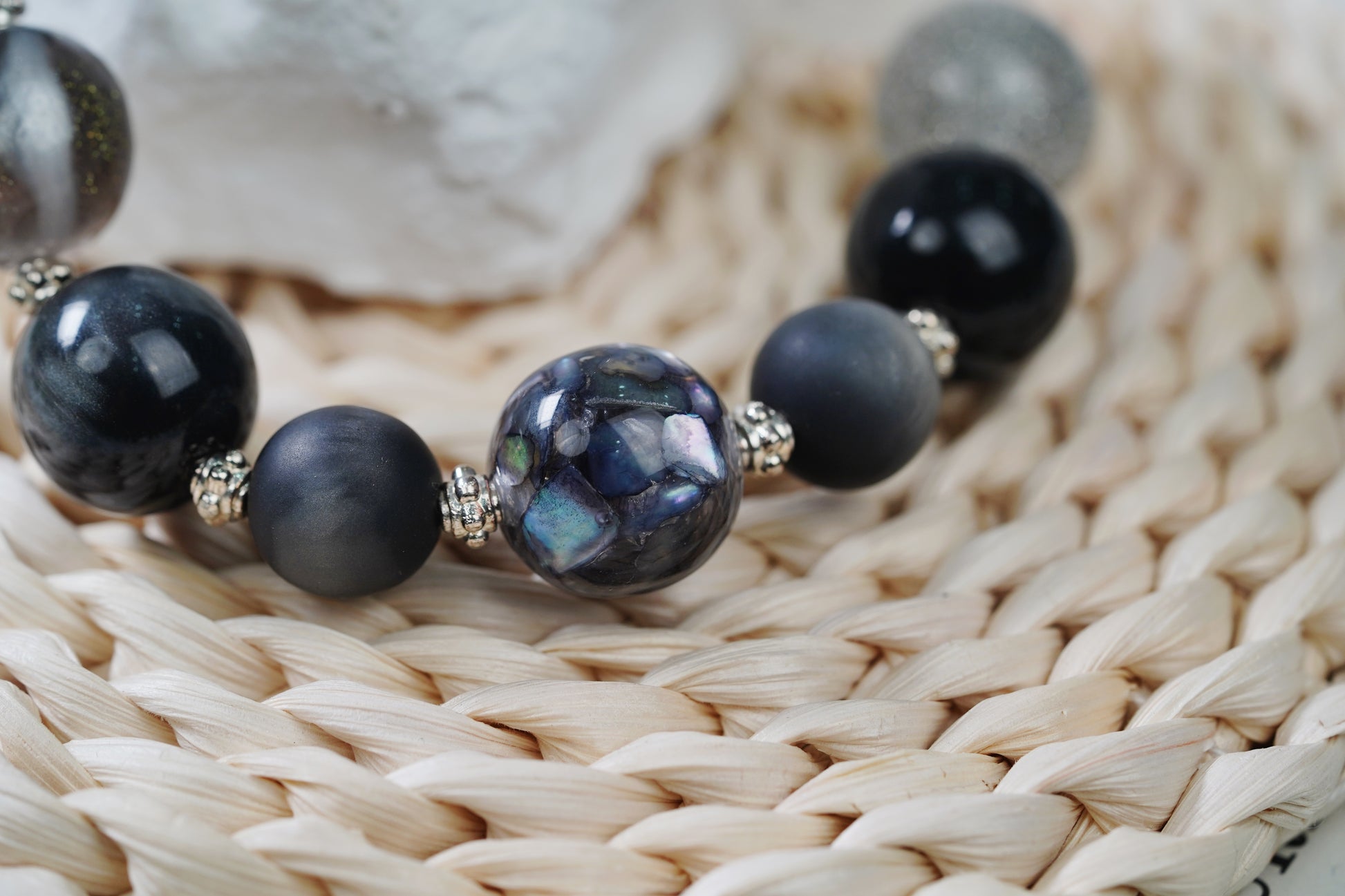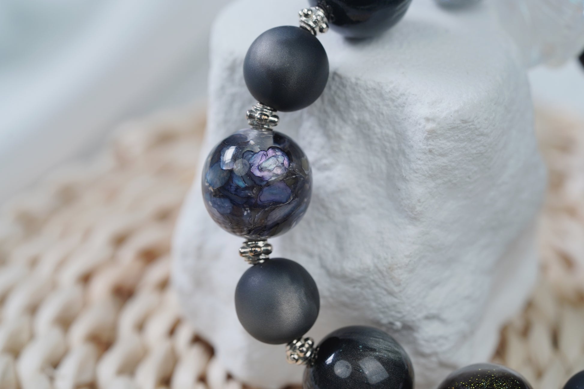 全体的に深い目のあるブラック系を基調とした、ミステリアスでクールな雰囲気を醸し出しています。ビーズの形態はさざまだから、表面のつや消しの質感が十分で、シルバーググレーの明るい粉が輝いているもののあれば、独特の透明な幻彩の造形があり、金属のアクセサリーを組み合わせて、簡潔な中で個性を発揮し、細部と独特の魅力を放っている。